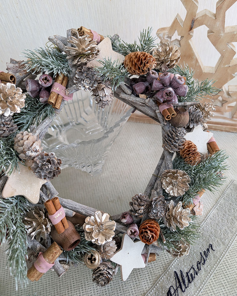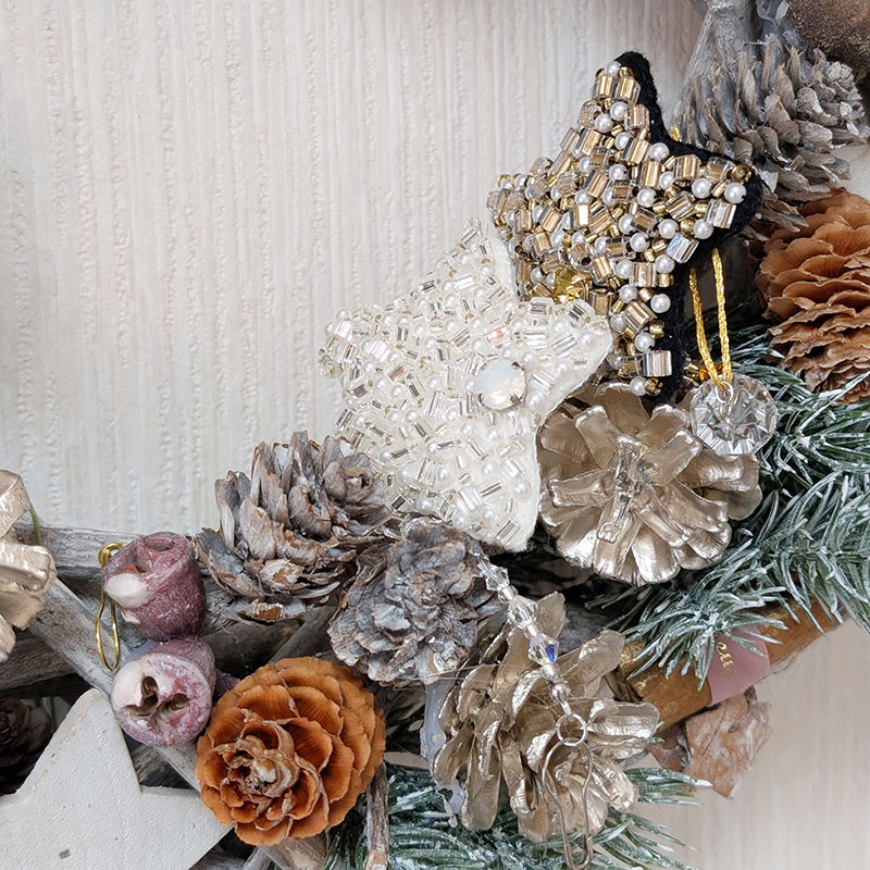 天然の小枝や松ぼっくり、シナモンスティックをふんだんに使用し、白銀の雪を思わせるフロスト加工を施してクリスマスらしい冬の静寂と高揚感を表現しました。12/25まで開催されており他にもたくさんのリースが展示されておりますので、ぜひお近くにお越しの際は足を運んでみて下さい。