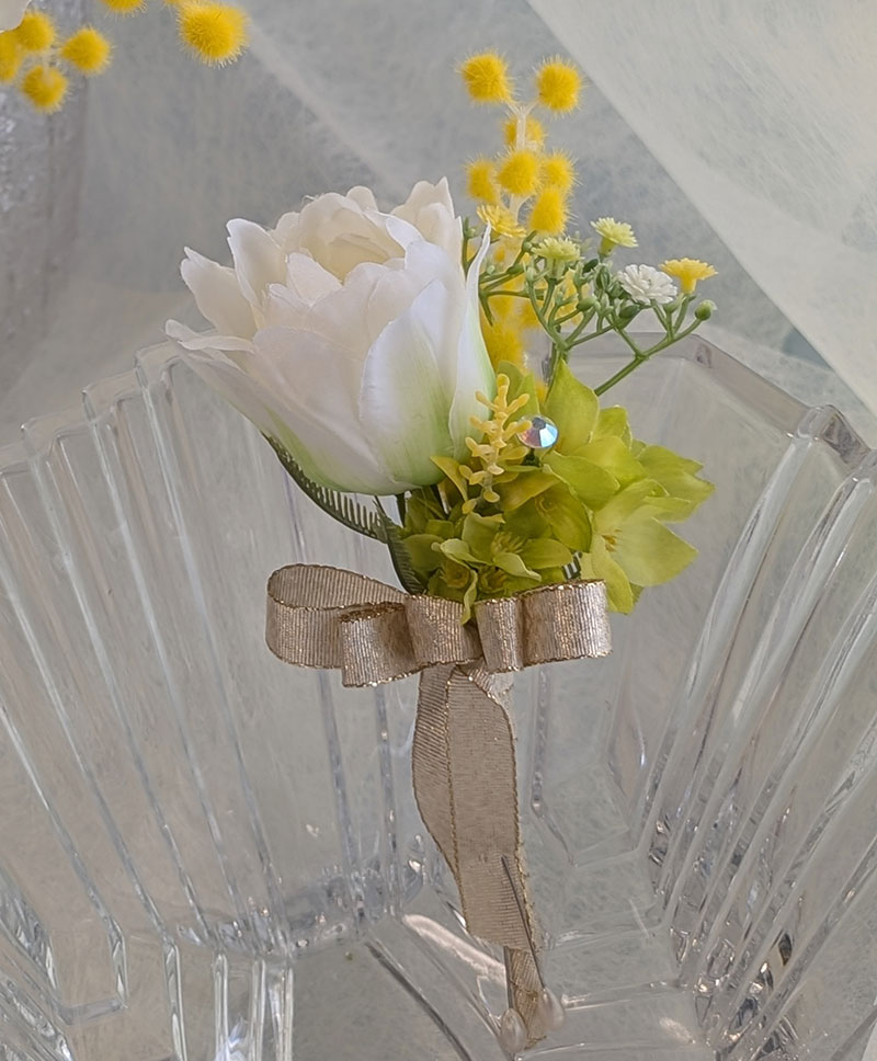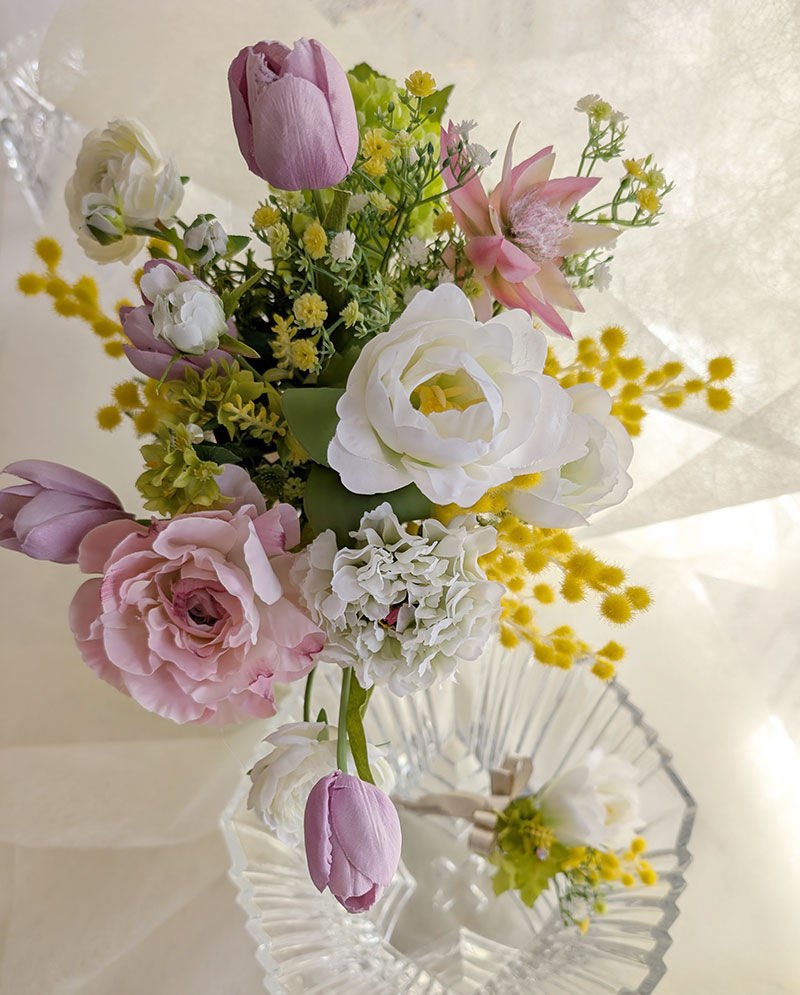 今回はウェディングブーケのご紹介です。花嫁様のグリーンのドレスに合わせた、アーティフィシャルフラワーブーケをお作りしました。春の野原から摘んできたようなナチュラルなイメージをご希望でした。ミモザをはじめチューリップ、ラナンキュラスなど春らしい淡く優しい色合いでまとめて、花嫁様の魅力を引き立たせてくれるように仕上げています。おそろいのブートニアも添えて。
