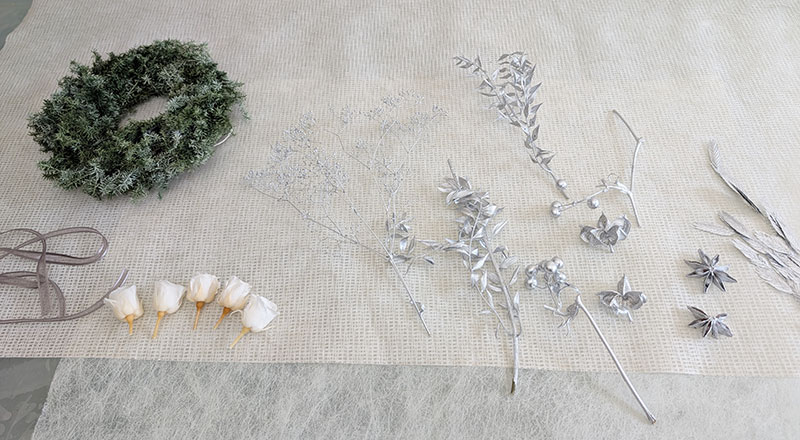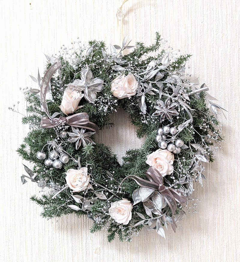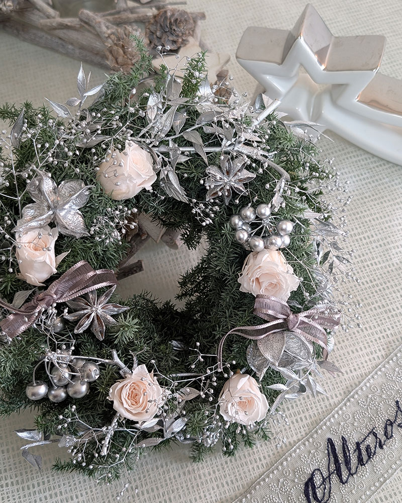 ヒムロスギの深いグリーンのリースに、シルバーメタルに塗ったカスミソウやサンキライ、スターアニスやワタカラなどの実もの、ラスカスなどの葉ものが、クリスマスらしい華やかさと輝きを与えてくれました。優しいホワイトのバラ ビビアンホワイトシャンパンが映えています。木馬のリボンはヨーロッパのトレンドカラーである艶のあるモカカラーが品よく上質に見せてくれます。