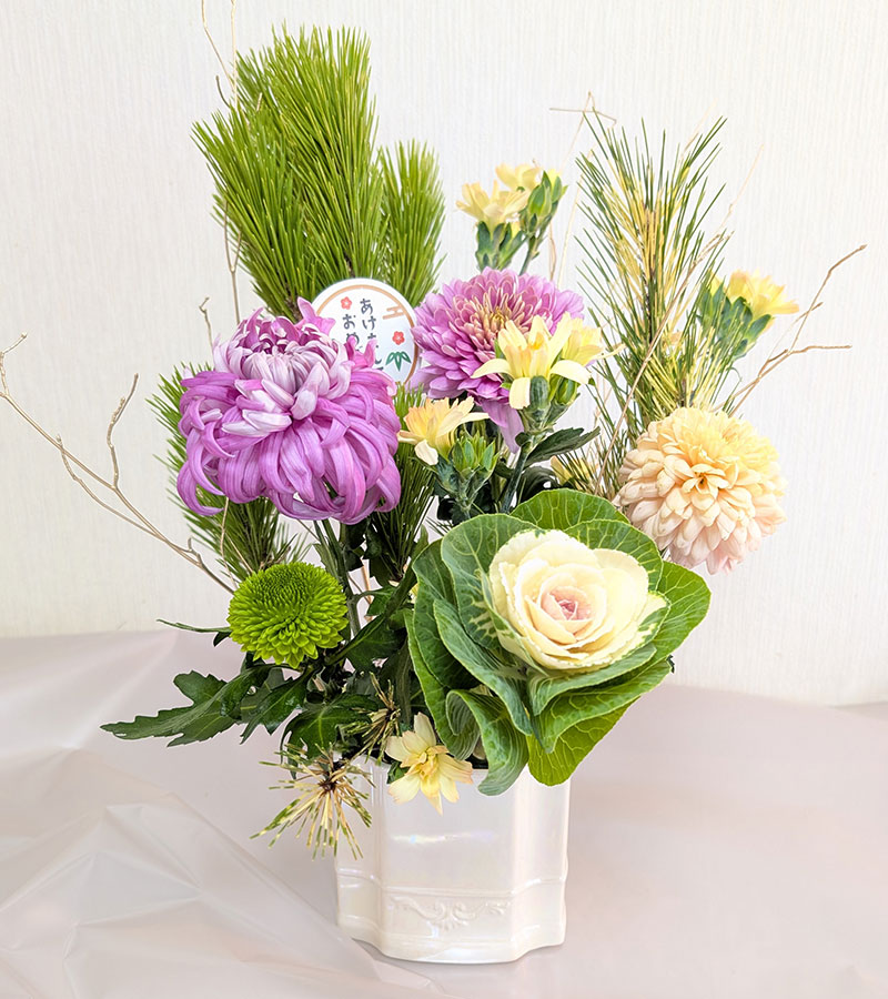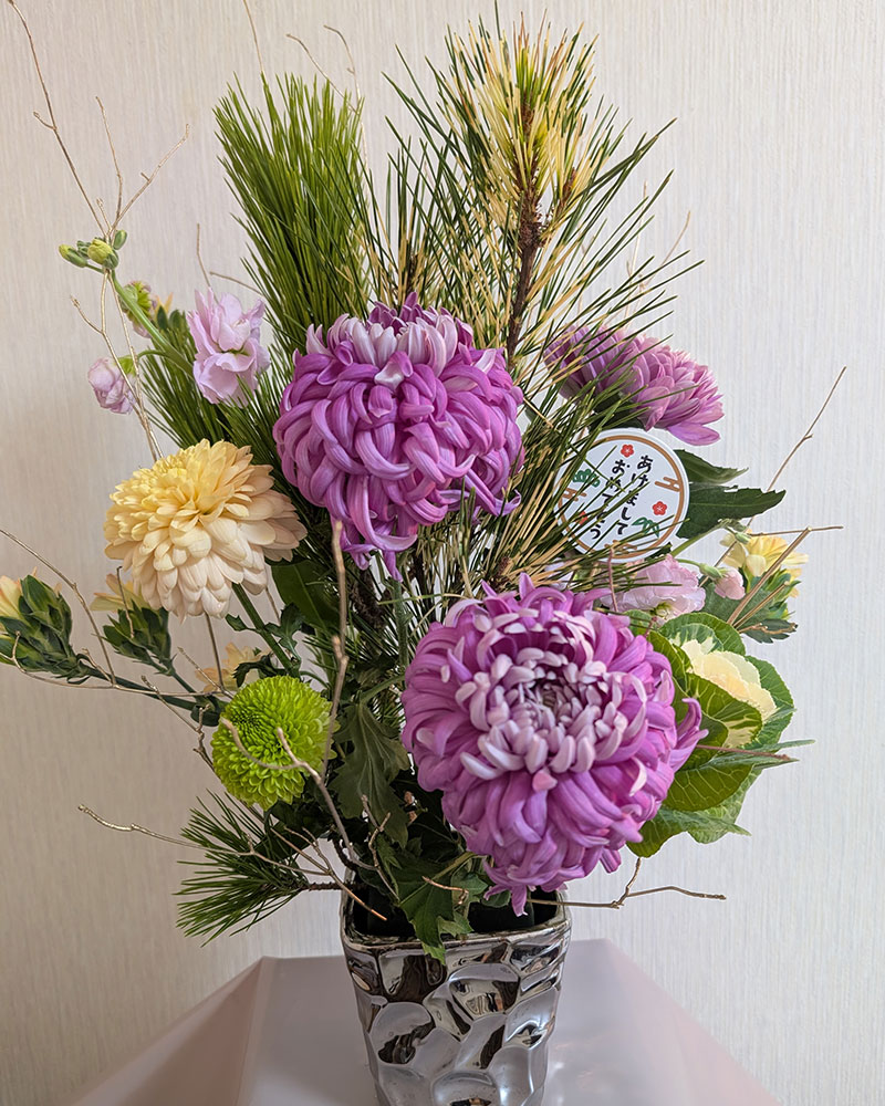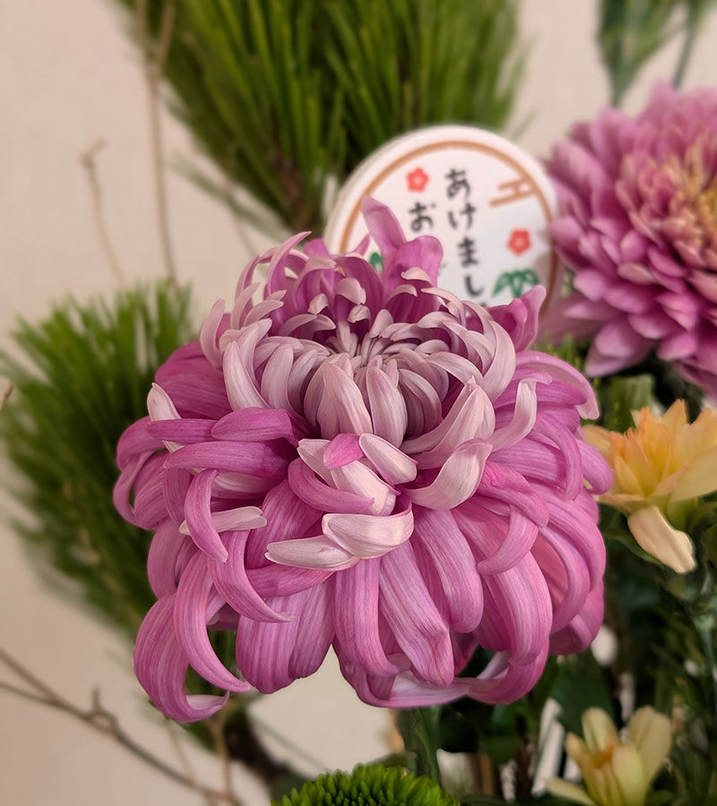 本年最初の投稿は、新しい年の始めを彩るお正月アレンジメントです。縁起のいい根引き松を始めとして八竜松、珍しい蛇の目松とハボタン、主役の大きなディスパッドマムを贅沢に組み合わせた格調高い仕上がり。中でもジャパンデザイン特別賞も受賞したパープルが鮮やかな「セイオペラ マノア」や、「セイオペラベージュ」「セイオペラクローク」「シャンパンピンク」の圧倒的な存在感とシャンパンゴールドに塗ったドーダンが、新しい年を祝う晴れやかな気分をより一層引き立ててくれます。