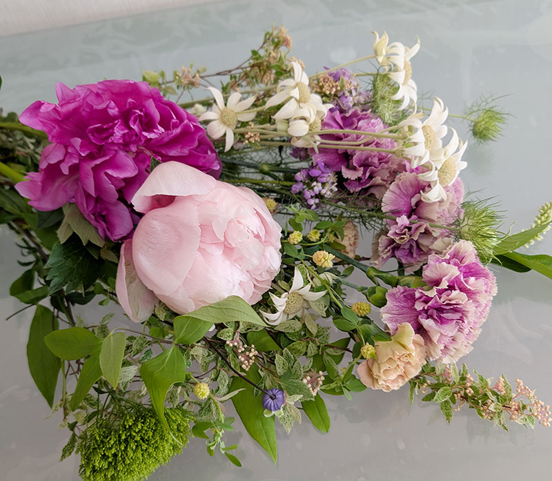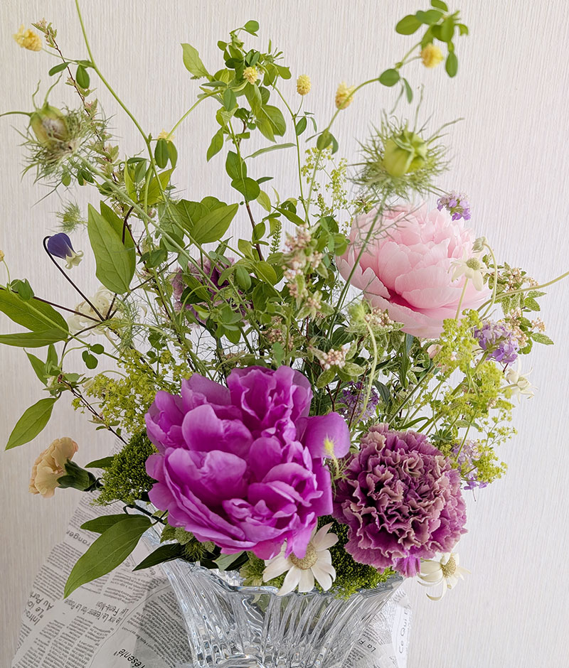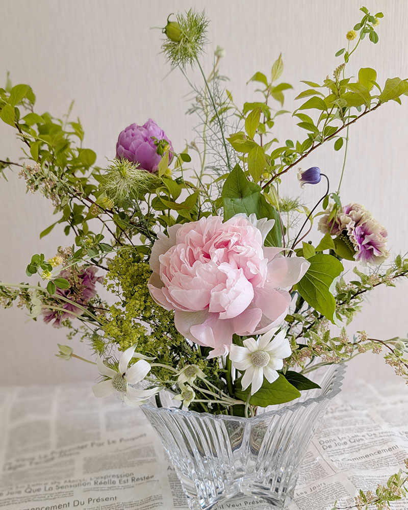 濃青の壺型が凛とした「クレマチス 雫」、長いつるの先に小さく黄色い花が咲く「夢ほたる」、ヒメリョウブやコデマリピンクアイスなどのグリーンが2つのシャクヤクを彩るようにアレンジしました。