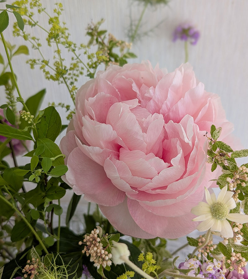 4月のマンスリーレッスンはシャクヤクです。淡く優しいピンクが可憐な「エッチドサーモンUB」は静岡県の野島さんが手がけており、彼のみが栽培しているため非常に入手困難な品種。品種名の「UB」は「優美」からきており、その希少性と美しさから、「幻の芍薬」とも称されています。一方もう1つのシャクヤク『華燭の典』は濃いピンクが艶やかで気品にあふれ、結婚式を意味する名前にふさわしい存在感。
